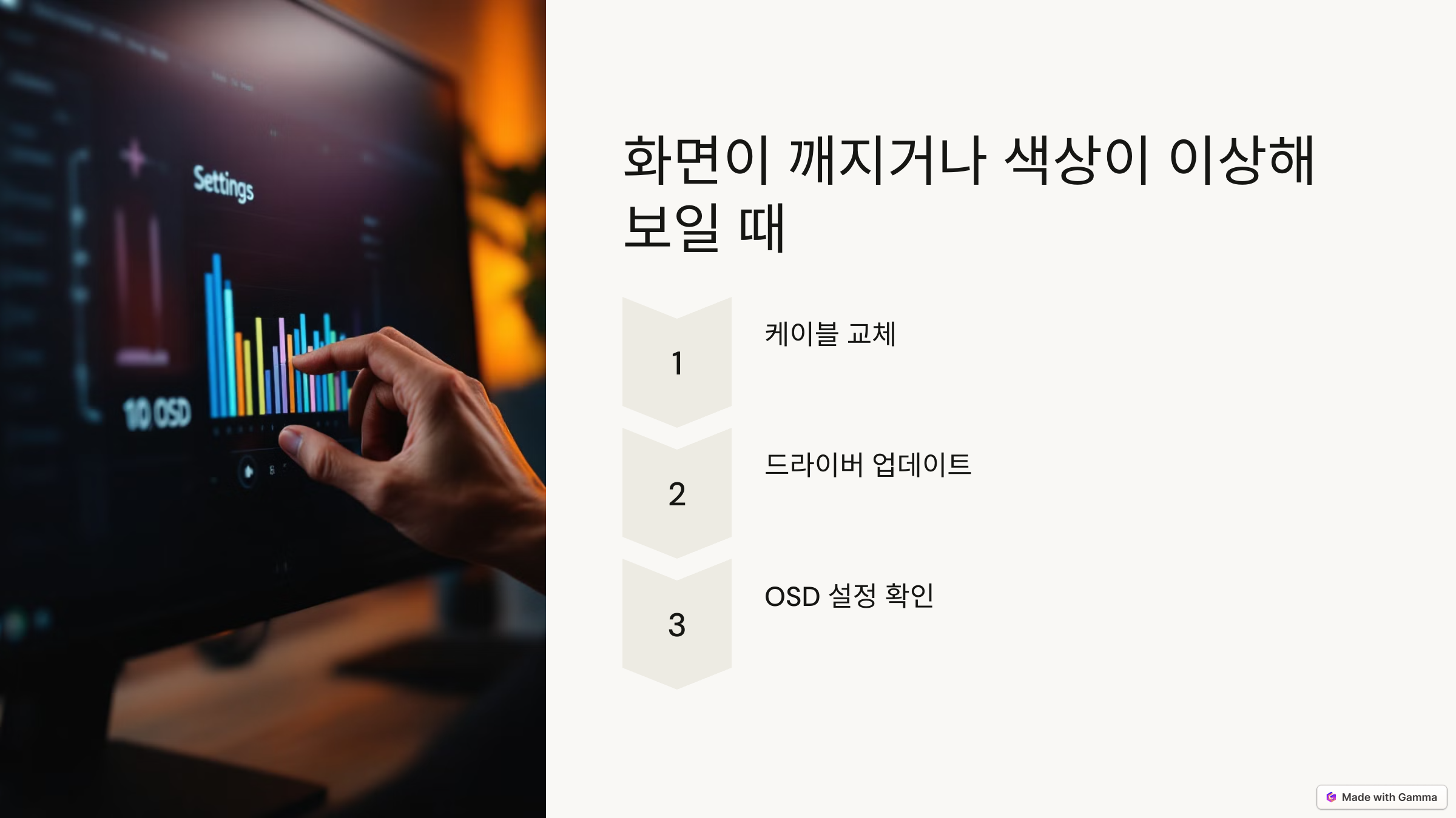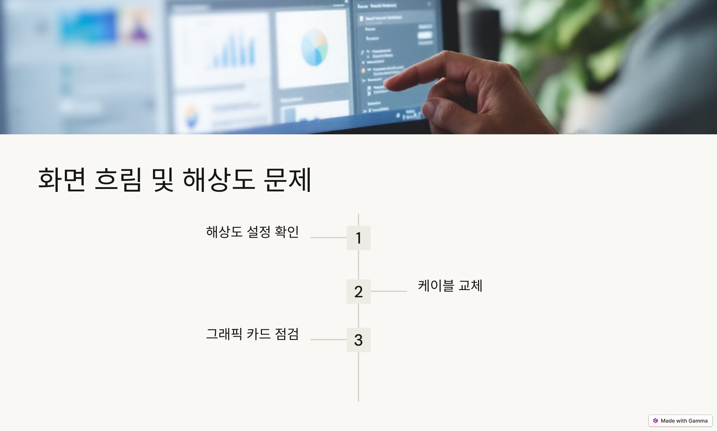 모니터 화면에 이상이 생길 때는 먼저 케이블 연결, 전원 상태, 그래픽 카드 드라이버 등을 확인하는 것이 중요합니다.