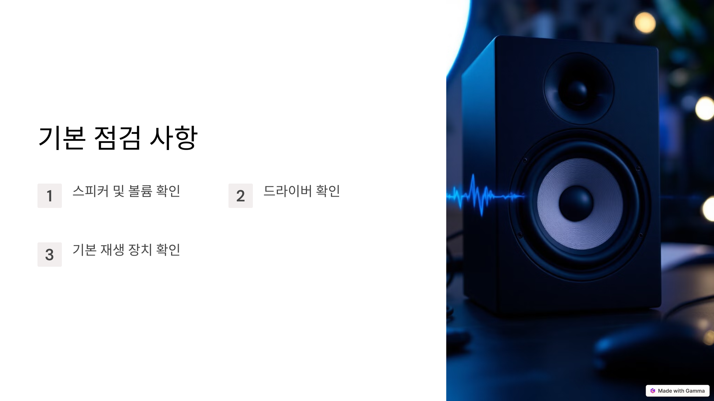 이번 글에서는 사운드가 안 나올 때 해결하는 방법을 단계별로 정리해 보겠습니다.