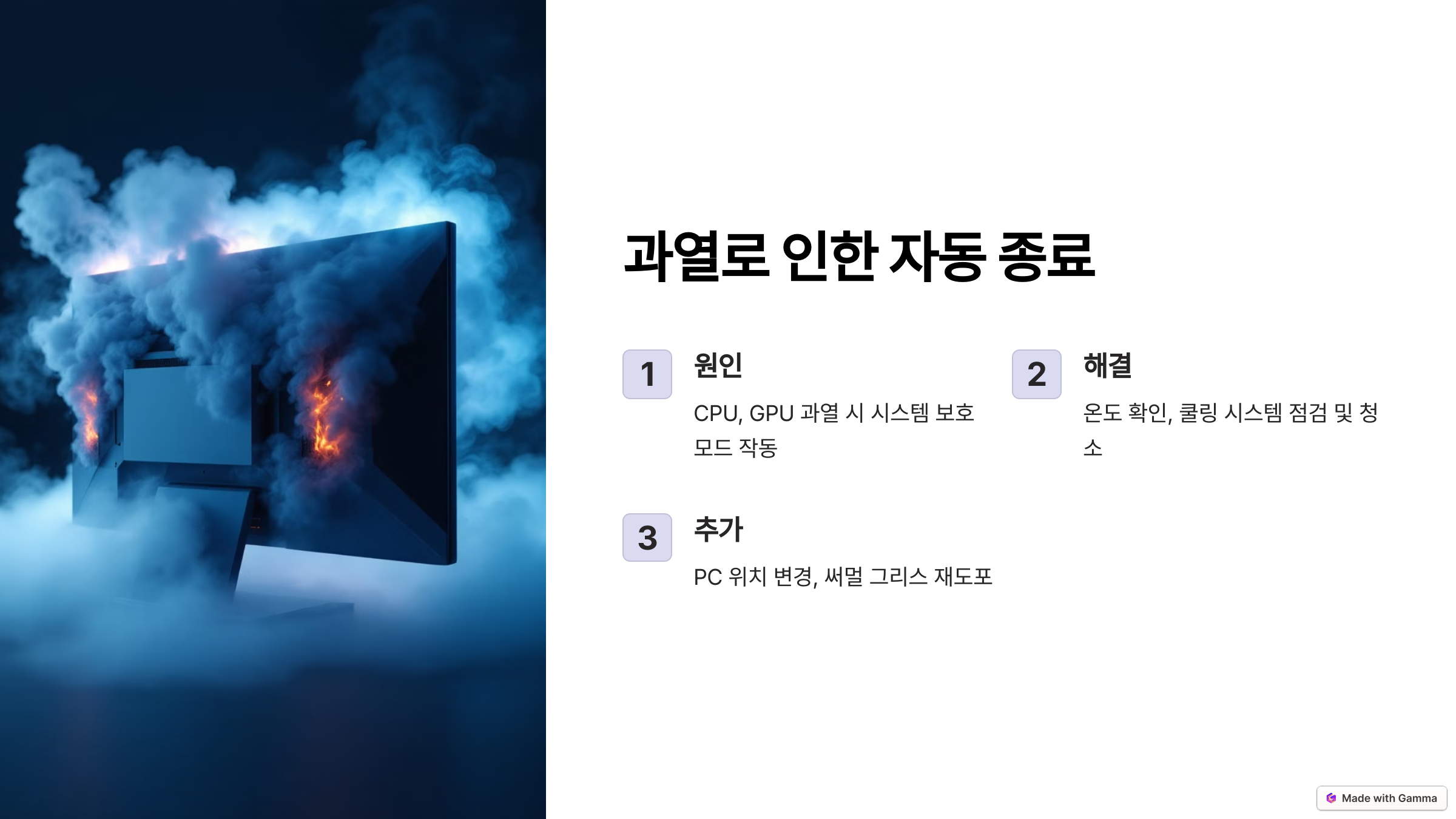 CPU, GPU(그래픽카드), 메인보드 칩셋 등이 과열되면 시스템이 이를 감지하고 보호 모드로 자동 종료됩니다. 특히, 냉각 팬이 먼지로 막혔거나 써멀 그리스가 마른 경우 열이 제대로 방출되지 않아 온도가 급상승할 수 있습니다.