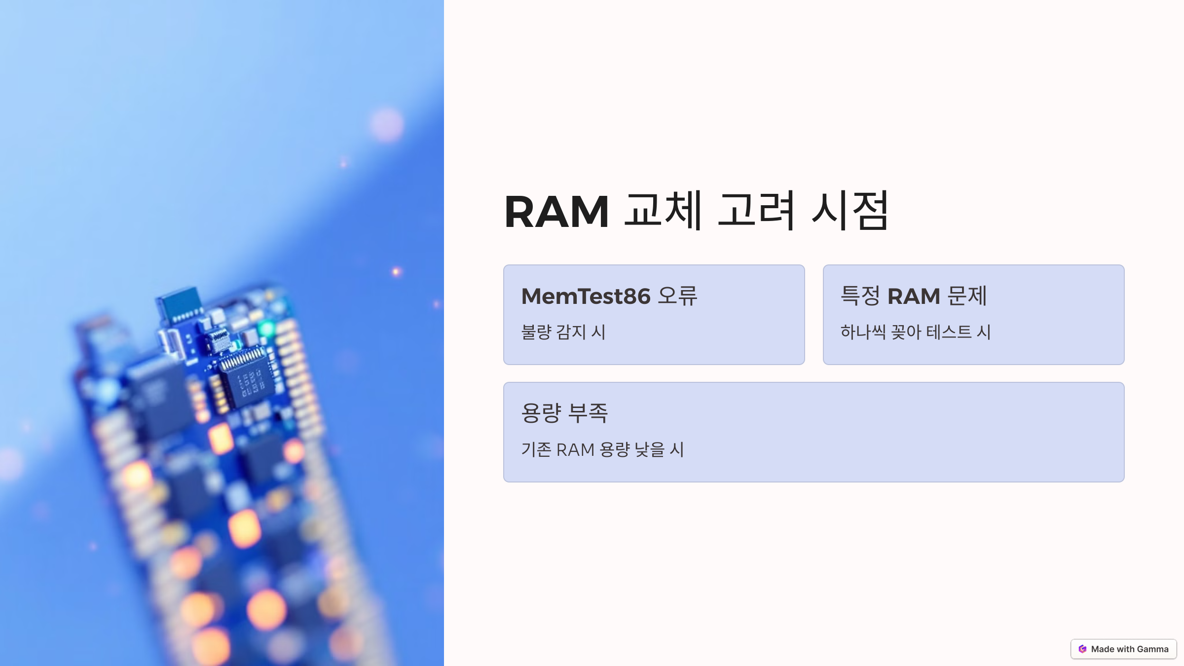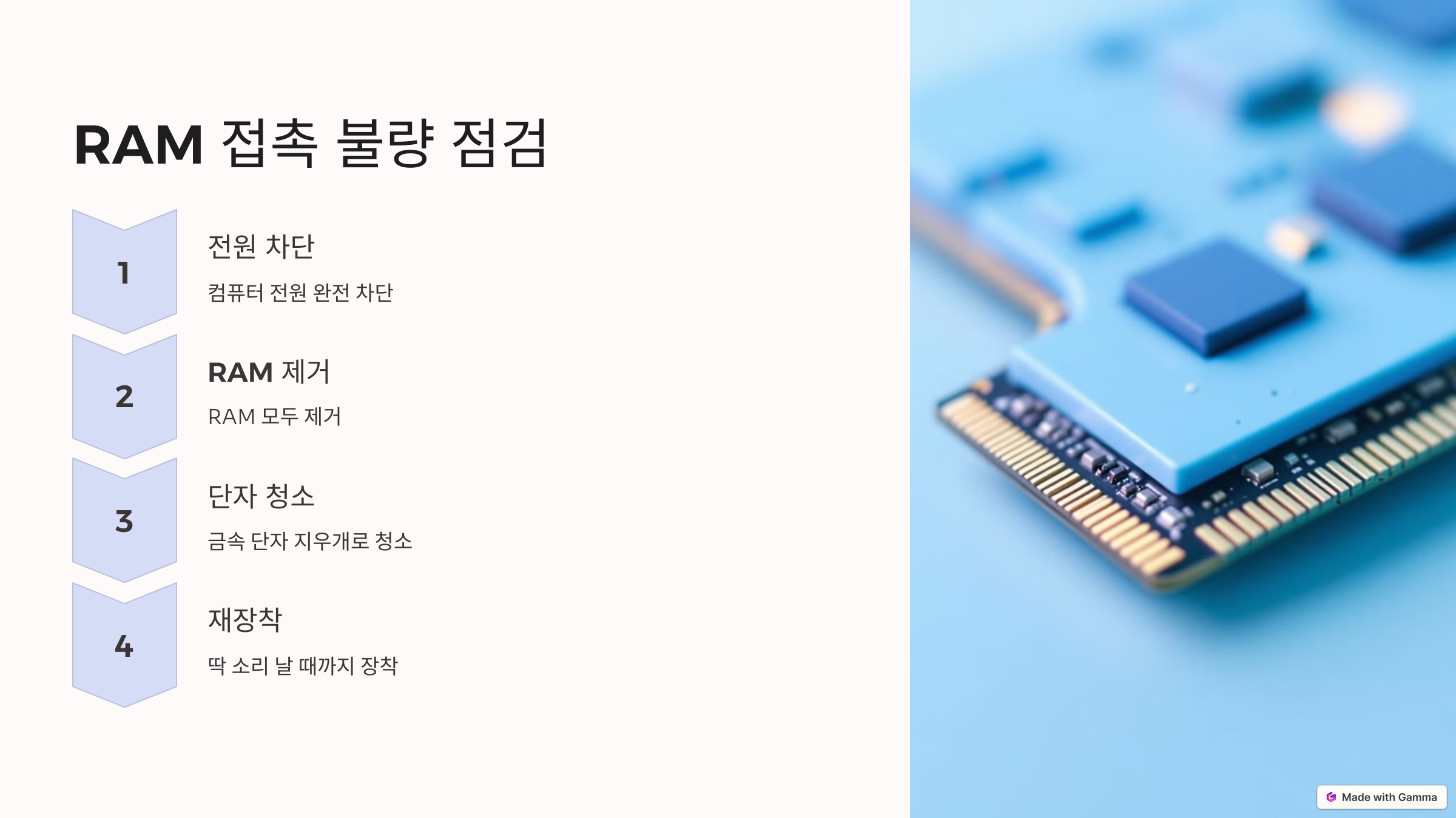 특히 RAM이 문제일 경우 메모리 오류, 접촉 불량, 메인보드 슬롯 문제 등이 원인이 될 수 있습니다.