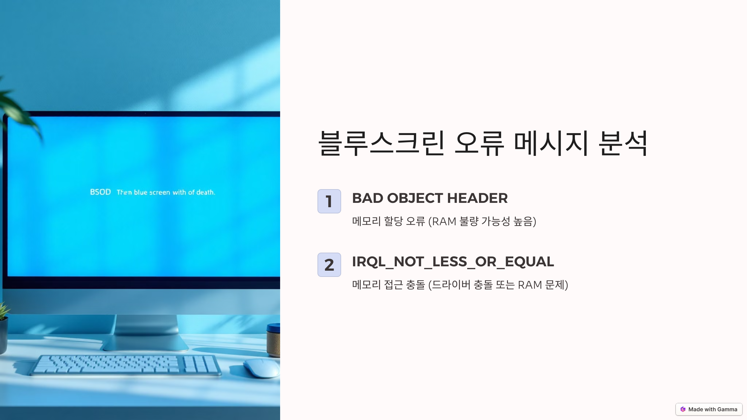 컴퓨터 사용 중 BAD OBJECT HEADER, IRQL_NOT_LESS_OR_EQUAL 등의 블루스크린(BSOD)이 발생하고 자동으로 재부팅되는 문제는 주로 RAM 불량, 드라이버 충돌, 또는 시스템 파일 손상으로 인해 발생합니다.