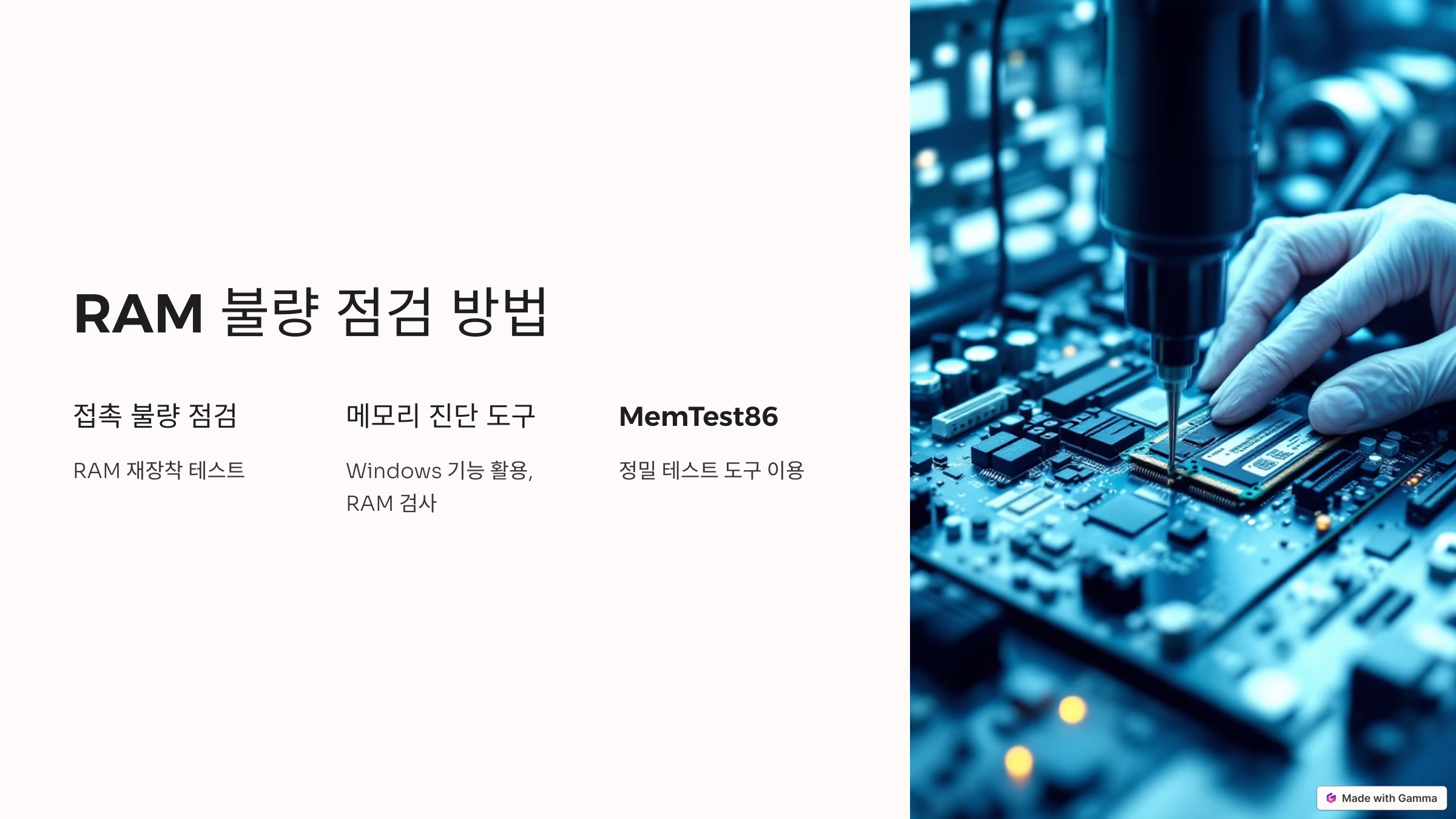 - RAM을 하나씩 장착하여 불량 RAM을 선별합니다.